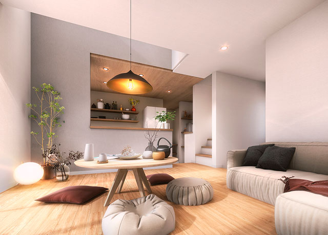 落ち着きのある「和」を取り入れ、「床座」を暮らしの中心にしたコンパクトな間取り。和の雰囲気にモダンデザインが調和し、安らぎを感じられるリラックススタイルです。